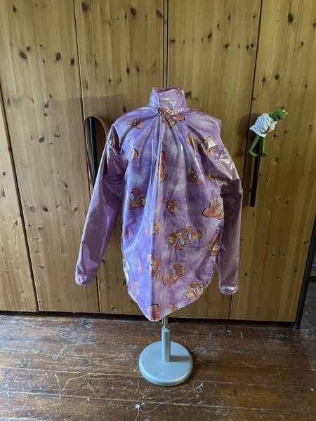 Each jacket will be extra for you. Outside layer in clear PVC and underneath a sweet baby print cloth material. You will be sweet and cute and well protected during mealtimes.