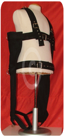 The harness keeps the sleeves in a restrictive unescapeable Position. All can be adjustet with the belts and velcroes. D-Rings will give more fixing points.