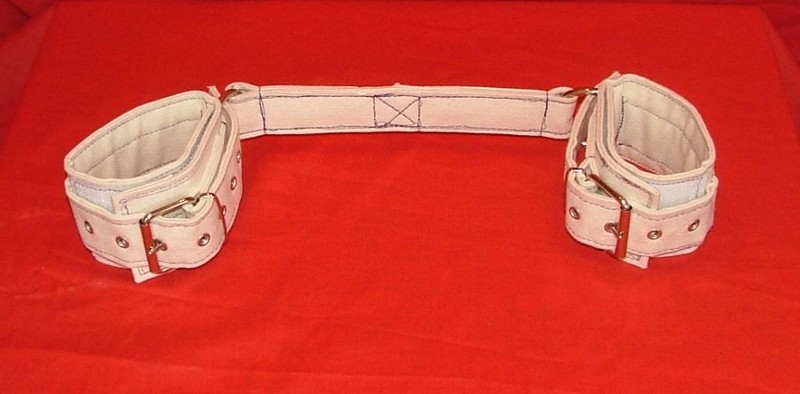 Made in 2 layers of heavy cotton - our miffs will keep your hands under contorl. just slip in and close or lock the belts. Also a fine optional for using handcuffs.