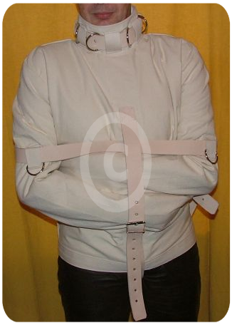 Diese tolle Zwangsjacke ist innenseitig besonders verstärkt und zum Verschluss mit ledernen Gurten versehen. sie wird durch 5 Gurte mit Schnallen am Rücken, Kragen mit Gurt, Rundumgurt und Schrittgurt fest verschlossen. 2 D-Ringe - jeweils an den Oberarmen und 4 D-Ringe am Kragen, sowie seitliche Führschlaufen und verstellbare Sicherungsschlaufe vor der Brust für die Arme bieten weitere Fixiermöglichkeiten und sorgen für zusätzliche Sicherheit.