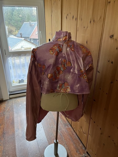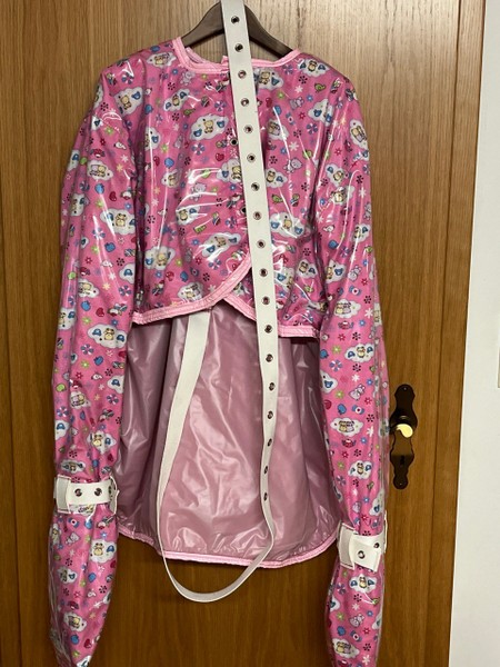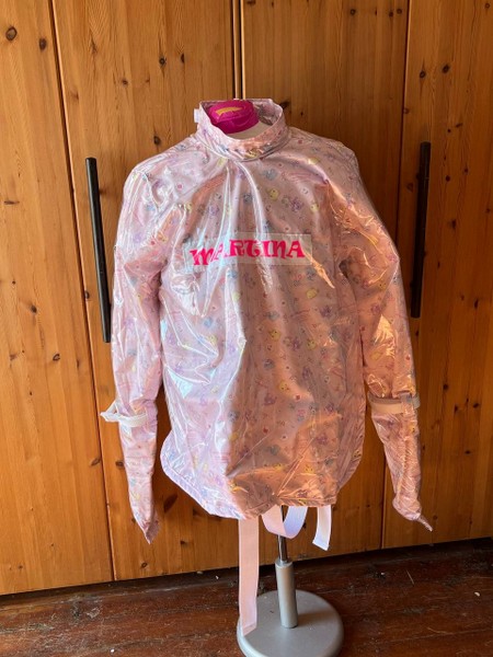 Each jacket will be extra for you. Outside layer in clear PVC and underneath a sweet baby print cloth material. You will be sweet and cute and well protected during mealtimes.
